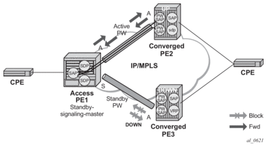 Conversely, the formerly standby pseudowire is made active and then the corresponding pseudowire port on the second Layer 3 PE is taken locally operationally up. Therefore, all of the pseudowire SAPs bound to the pseudowire port are brought up, which causes the corresponding IES or VPRN interface to go to a local operationally up state allowing forwarding of packets towards this pseudowire port.