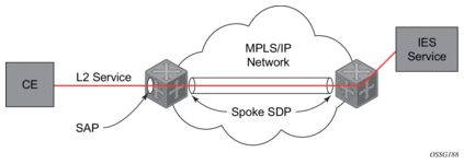 Figure 8 depicts a spoke-SDP terminating directly into a Layer 3 service interface (IES or VPRN) at one end, and a Layer 2 service (Epipe, Ipipe, or VPLS) at the other. There is no special configuration required on the Layer 2 service.