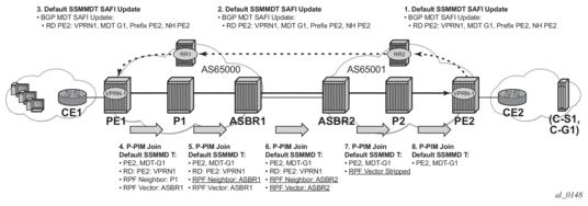 Inter-AS Option B is supported for Rosen MVPN PIM SSM using BGP MDT SAFI, PIM RPF Vector and BGP Connector attribute. The Figure 43 depict set-up of a default MDT: