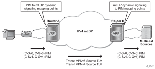 4 | Transit IPv6 | RFC 6826 | IPv6 multicast over mLDP in GRT |