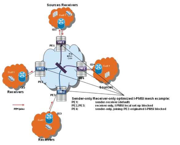 I-PMSI and S-PMSI functionality follows RFC 6513 section 8.1.1 and RFC 6512 sections 3.1 and 3.2.1. For routing, the same rules as for GRT d-mLDP use case apply, but the VRR Route Import External community now encodes the VRF instance in the local administrator field.