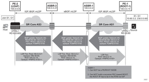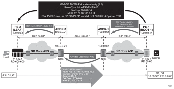 Refer to the “Inter-AS Non-segmented MLDP” section of the 7450 ESS, 7750 SR, 7950 XRS, and VSR MPLS Guide for more information.