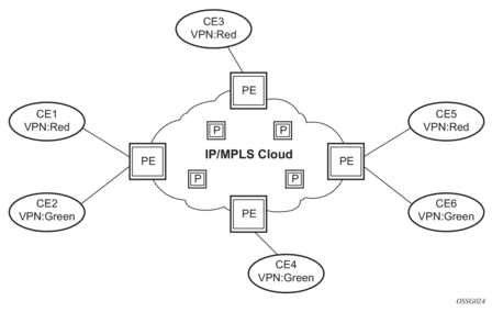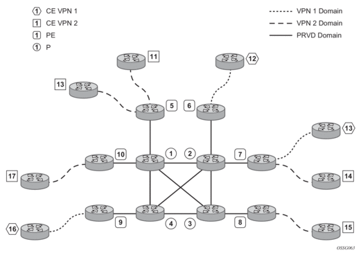Before a customer data packet travels across the service provider's backbone, it is encapsulated with the MPLS label that corresponds, in the customer's VPN, to the route which best matches the packet's destination address. The MPLS packet is further encapsulated with one or additional MPLS labels or GRE tunnel header so that it gets tunneled across the backbone to the proper PE router. Each route exchanged by the MP-BGP protocol includes a route distinguisher (RD), which identifies the VPRN association. Thus the backbone core routers do not need to know the VPN routes. Figure 9 displays a VPRN network diagram example.