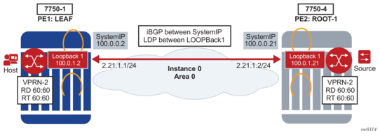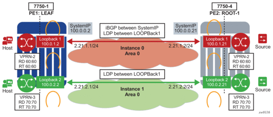 Because the system IPs of the peer PEs (Root-1 and Root-2) are not installed on the local PE (leaf), it is possible to have two PEs in different ASs with same system IP address, as shown in Figure 47. However, SR OS does not support this topology. The system IP address of all nodes (root or leaf) in different ASs must be unique.