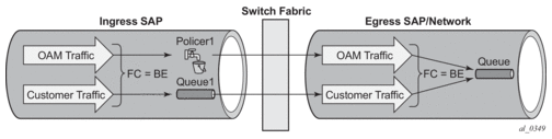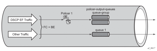 This could be used, for example, when it is required that egress traffic with a DSCP value EF is to be policed instead of shaped in a queue on a given SAP. The traffic could be classified based on its DSCP value and directed to policer 1 while the remainder of the customer’s traffic is processed using egress queue 1. This is shown in Figure 14.