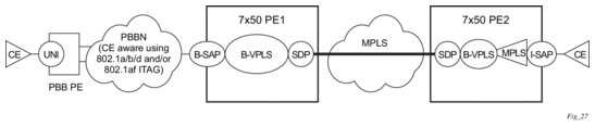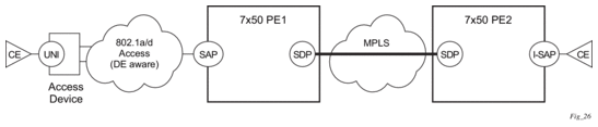 Figure 16 shows an example of a topology where the new DE feature may be used: a DE aware, 802.1ad access network connected via a regular SAP to a router PE.