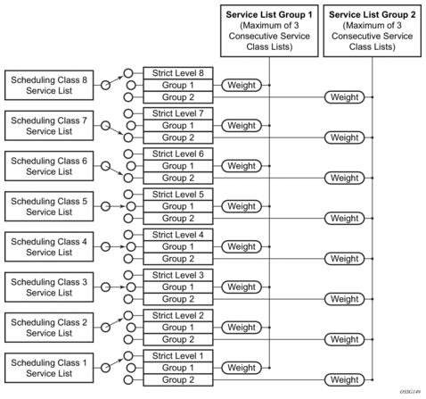 To allow for weighted servicing of selected scheduling classes, the port scheduler allows for two weighted groups to be optionally created (weighted-group-1 and weighted-group-2) and each may be populated with up to three consecutive scheduling classes (see Figure 42). The group itself maps to the highest inherent strict scheduling level of its member scheduling classes. Each scheduling class in a scheduling group are individually weighted, which allows for all queues represented by the class to be serviced according to the ratio of weights based on the active classes in the group (see Figure 43).