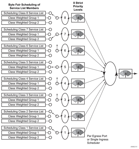 Forwarding for each egress port on the HSMDA is managed by a port-based scheduler. Each port-based scheduler maintains a maximum of eight strict forwarding levels (see Figure 41). Strict level 8 is the highest priority while strict level 1 is the lowest. There are also eight scheduling classes that contain each of the queues assigned to the port scheduler. A queues membership in a scheduler class is controlled by the queue’s identifier. For example, all queues with a queue-id equal to 1 are in scheduler class 1 while all queues with queue-id equal to 2 are in scheduler class 2. By default, each scheduler class is directly mapped to its corresponding strict scheduling level.