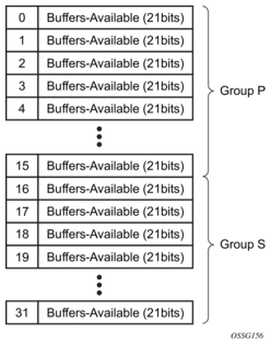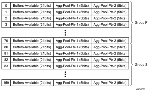 The aggregate control buffer pools are separated into two sets. The first 16 pools (0 through 15) are used by the provisioned group (group P) port class pools. The second 16 pools (16 through 31) are used by the system group (group S) port class pools.
