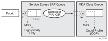 Table 112 and Figure 51 describe the class queue threshold parameters. Packets marked with a high drop precedence, such as out-of-profile, by the service or network ingress QoS policy will be discarded when any class queue reaches the OOP threshold. Packet with a low drop precedence marking, such as in-profile, will be discarded when any class queue reaches the max threshold.