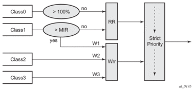Class 2 and 3 queues can be given bandwidth guarantee by limiting MIR of class 1 queue to less than 100% and by setting the WRR weights W1, W2, and W3 to achieve the desired bandwidth distribution among all three class queues.
