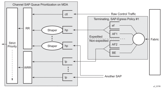 Some minor modifications are introduced to accommodate end-to-end FRF.12 fragments. The user-configured FR scheduling class for this SAP will dictate which of the FR SAP XMA or MDA queues should be used to queue the fragments. Classes 0 and 1 map all fragments of the FR SAP to the high-priority SAP queue. Classes 2 and 3 map all fragments of the FR SAP to the low-priority SAP queue.
