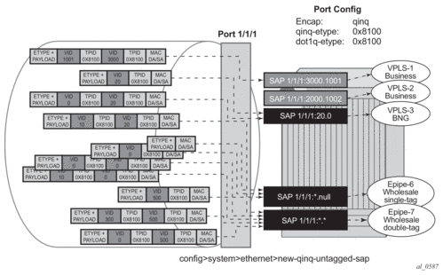 This feature introduces default SAP functionality on Dot1q-encapsulated ports. This is similar to the functionality provided by Q1* SAP on QinQ encapsulated ports, meaning that on On dot1q-encapsulated ports where a default SAP is configured, all packets with q-tags not matching any explicitly defined SAPs will be assigned to this SAP. SAPs with default QinQ encapsulation are supported in VPLS, Epipe, IES and VPRN services. Both DHCP snooping and IGMP snooping are supported for QinQ SAPs. In this context, the character “*” indicates default which means allow through. A 0 value means that it should not be there which allows the Qtag to be missing.