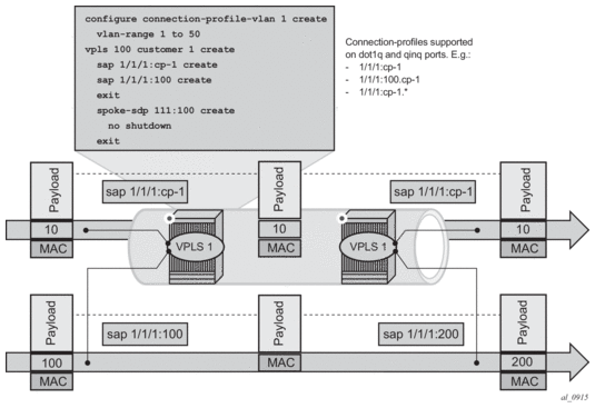The connection-profile-vlan SAPs (CP SAPs) allow the association of a range of customer VIDs to a given SAP. CP SAPs can be used to build Layer 2 Services that are fully compatible with MEF 10.3 Bundling Service Attributes and RFC 7432 EVPN VLAN Bundle Service interfaces.