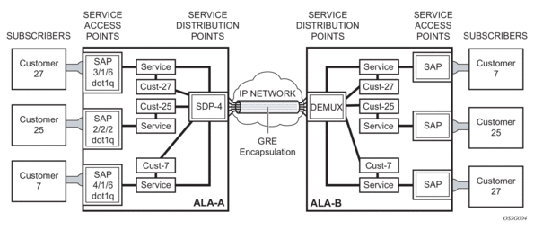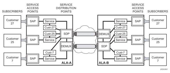 Distributed services use service distribution points (SDPs) to direct traffic to another Nokia router through a service tunnel. SDPs are created on each participating router, specifying the origination address (the router participating in the service communication) and the destination address of another router. SDPs are then bound to a specific customer service. Without the binding process, far-end router is not able to participate in the service (there is no service without associating an SDP with a service).