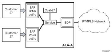Each subscriber service type is configured with at least one service access point (SAP). A SAP identifies the customer interface point for a service on a router (for example Figure 6). The SAP configuration requires that slot, XMA or MDA, and port/channel information be specified. The slot, XMA or MDA, and port/channel parameters must be configured prior to provisioning a service (Refer to the XMAs, Cards, MDAs, and Ports sections of the SR OS Interface Configuration Guide).