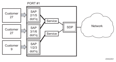 As shown in Figure 8, assuming that the new-qinq-untagged-sap command is enabled, the following SAPs are defined on the same port: