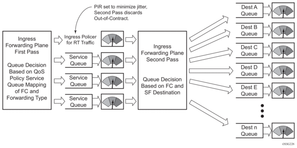 Ingress multipoint shared queuing is a variation to the unicast shared queuing defined in Ingress Shared Queuing on page 15. Ingress unicast service queues are mapped one-for-one with hardware queues and unicast packets traverse the ingress forwarding plane twice. In addition to the above, the multipoint queues defined in the ingress SAP QoS policy are not created. Instead, multipoint packets (broadcast, multicast and unknown unicast destined) are treated to the same dual pass ingress forwarding plane processing as unicast packets. In the first pass, the forwarding plane uses the unicast queue mappings for each forwarding plane. The second pass uses the multipoint shared queues to forward the packet to the switch fabric for special replication to all egress forwarding planes that need to process the packet.