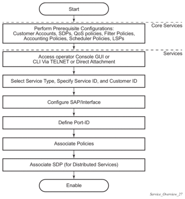 A service is a globally unique entity that refers to a type of connectivity service for either Internet or VPN connectivity. Each service is uniquely identified by a service ID and an optional service name within a service area. The Nokia service router model uses logical service entities to construct a service. In the service model, logical service entities provide a uniform, service-centric configuration, management, and billing model for service provisioning.