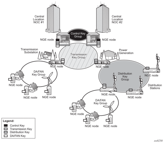 Figure 28 shows a typical application of NGE key-group partitioning in which there are several critical levels (tiers) of security that need to be considered. In this example, the protection of Distribution Automation and Field Area Network (DA/FAN) equipment are less critical than the Transmission or Distribution Substation network equipment. Ensure that nodes more at risk of a security breach do not contain more critical information than is necessary. Therefore, encryption keys for the sensitive portions of the network (such as control center traffic) should not be available on nodes that are at risk. The NGE feature enables operators to partition and distribute encryption keys among different services, NGE domains, or nodal groups in a network. NGE partitions are enabled by configuring different key groups per security partition and applying those key groups as needed.