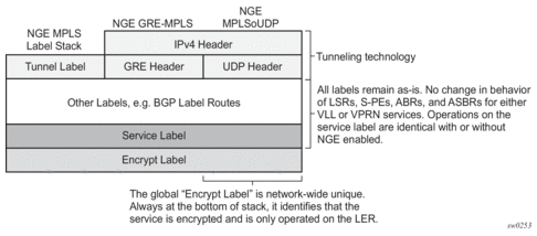 NGE adds a global encryption label to the label stack for encrypting MPLS services. The global encryption label must be a unique network-wide label; in other words, the same label must be used on all nodes in the network that require NGE services. The label must be configured on individual nodes before NGE can become operational on those nodes.