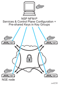 The NSP NFM-P acts as the key manager for NGE-enabled nodes and allocates the keys in key groups that are used to perform encryption and authentication. The NSP NFM-P ensures that all nodes in a key group are kept in synchronization and that only the key groups that are relevant to the associated nodes are downloaded with key information.