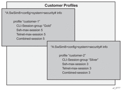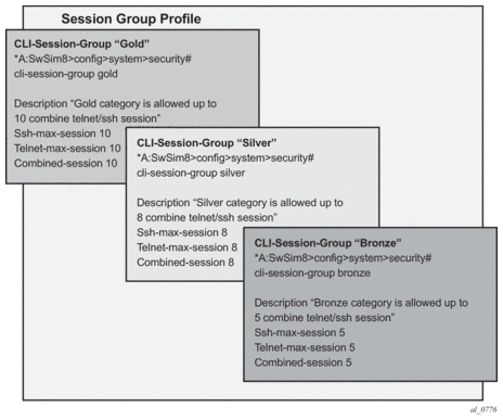 SR OS has the capability to manage telnet/ssh sessions per user and at a higher level per system. At the system level, the user can configure a cli-session-group for different customer priorities. The cli-session-group is a container that sets the maximum number of CLI sessions for a class of customers, with a unique session limit for each customer. For example, as depicted in Figure 12, “Gold” category customers can have a cli-session-group that allows them more telnet/ssh sessions compared to “Silver” category customers.