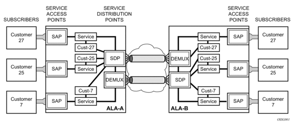 Distributed services use service distribution points (SDPs) to direct traffic to another 7450 ESS or 7750 SR OS through a service tunnel. SDPs are created on each participating 7450 ESS or 7750 SR OS, specifying the origination address (the router participating in the service communication) and the destination address of another 7450 ESS or 7750 SR OS. SDPs are then bound to a specific customer service. Without the binding process, far-end 7450 ESS and 7750 SR devices are not able to participate in the service (there is no service without associating an SDP with a service).