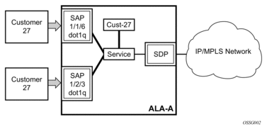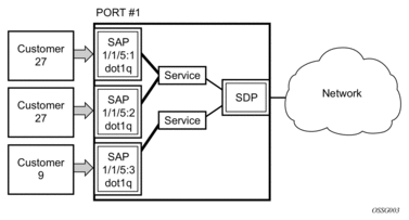 Each SAP configuration includes a specific port/channel (applies to the 7750 SR) on which service traffic enters the router from the customer side (also called the access side). Each port is configured with an encapsulation type. If a port is configured with an IEEE 802.1Q (referred to as dot1q) encapsulation, then a unique encapsulation value (ID) must be specified.