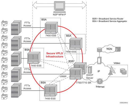 The connectivity between BSAs and BSRs is a Layer 2 forwarding model shown in Figure 2 above as a secure VPLS infrastructure. This refers to the fact that the BSA-BSR interconnections form a multipoint Ethernet network with security extensions to prevent unauthorized communication, denial of service, and theft of service. One of the advantages of using VPLS for this application is that VPLS instances can be automatically established over both ‘hub and spoke’ and ring topologies providing sub-50 ms resilience. Regardless of the fiber plant layout, VPLS enables a full mesh to be created between BSA and BSR nodes, ensuring efficient traffic distribution and resilience to node or fiber failure.