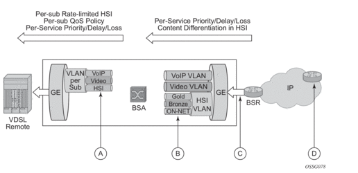 D | Video/VoIP: Policy defines priority aggregate CIR/PIR. HSI: QoS policy defines priority and aggregate CIR/PIR. Content differentiation based on ingress classification. DSCP is marked. |