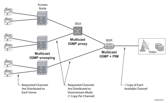Efficient multicasting requires the distribution of functions throughout the access and the aggregation network to avoid overloading the network capacity with unnecessary traffic. TPSDA realizes efficient multicasting by implementing IGMP snooping in the access nodes, IGMP snooping in the BSA and multicast routing in the BSR (Figure 5).