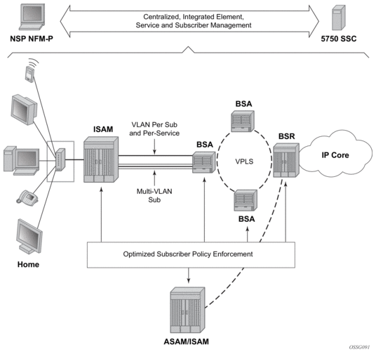 Nokia’s Triple Play Service Delivery Architecture (TPSDA) advocates the optimal distribution of service intelligence over the BSAN, BSA and BSR, rather than concentrating on fully centralized or decentralized BRAS models which artificially define arbitrary policy enforcement points in the network. With the SR OS, the optimized enforcement of subscriber policies across nodes or over a single node (as dictated by evolving traffic patterns), allows a more flexible, optimized, and cost-effective deployment of services in a network, guaranteeing high quality and reliable delivery of all services to the user.