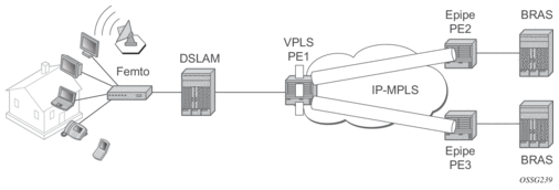 Figure 6 displays a Layer 2 PE network (such as the ESS-Series) aggregating traffic from DSLAMs (Nokia) to BRAS devices. The VPLS service is running in the PEs directly connected to the DSLAMs (VPLS PE1) while the PEs connected to the BRAS devices are running a point-to-point Layer 2 service (Epipe).