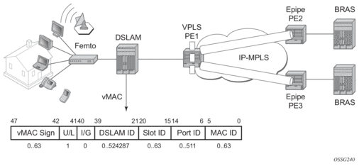 The VPLS instance in PE1 only learns the first part of the MAC (bits 47 — 21) and, as the packets arrive from the BRAS device, switches based only on these bits in the destination MAC address to differentiate between the connected DSLAMs. Once the packet arrives at the DSLAM, the entire destination MAC is checked to determine the slot, port and which specific customer station the packet is destined to. As the packet is sent to the customer, the DSLAM replaces the destination MAC address with the actual customer MAC corresponding to the customer station.