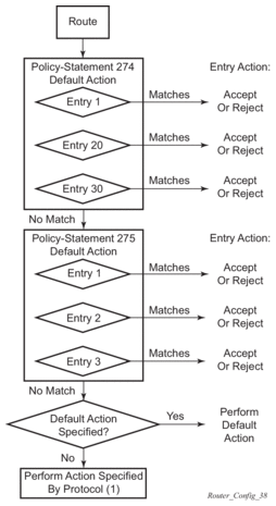 Routing policy statements can consist of as few as one or several entries. The entries specify the matching criteria. A route is compared to the first entry in the policy statement. If it matches, the specified entry action is taken, either accepted or rejected. If the action is to accept or reject the route, that action is taken and the evaluation of the route ends.
