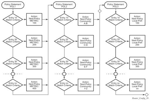 Route policies can also match a given route policy entry and continue to search for other entries within either the same route policy or the next route policy by specifying the next-entry or next-policy option in the entry’s action command. Policies can be constructed to support multiple states to the evaluation and setting of various route attributes.