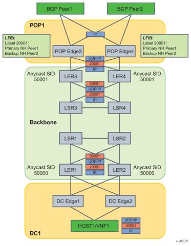 This label 20001 is configured on POP Edge3/4 using the static label route feature with primary next-hop of Peer1 and backup next-hop of Peer2.