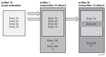 The insertion point of the flowspec rules in each embedding filter policy is controlled through offset configuration. For more information, see the BGP flowspec section of the 7450 ESS, 7750 SR, 7950 XRS, and VSR Unicast Routing Protocols Guide.