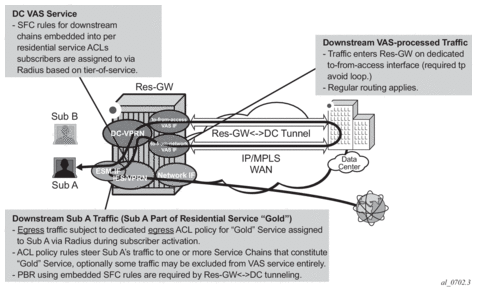 Figure 35 shows downstream VAS service chaining steering using filter policies. Downstream subscriber traffic entering Res-GW is forwarded to a subscriber-facing line card. On that card, the traffic is subject to the subscriber's egress ACL filter policy processing assigned to that subscriber by a policy server. If the ACL contains VAS steering rules, the VAS rule-matching subscriber's traffic is steered for VAS processing over a dedicated to-from-network VAS interface (in the same or a different routing instance). After the VAS processing, the downstream traffic must be returned to Res-GW via a “to-from-network” interface (shown in Figure 35) to ensure the traffic is not redirected to VAS again when the subscriber-facing line card processes that traffic.