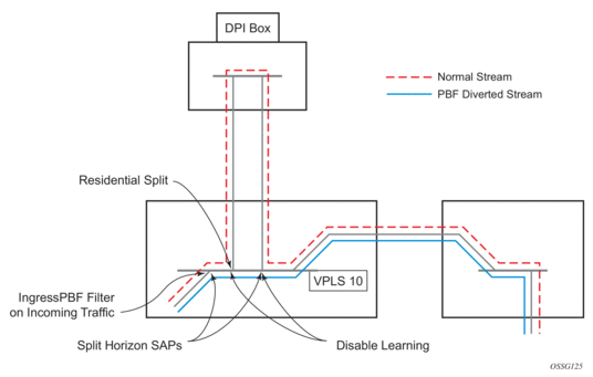 Figure 36 shows an example to configure policy-based forwarding for deep packet inspection on a VPLS service. For information about configuring services, refer to the 7450 ESS, 7750 SR, 7950 XRS, and VSR Layer 2 Services and EVPN Guide: VLL, VPLS, PBB, and EVPN.