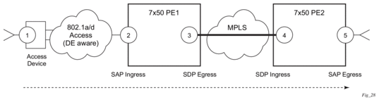 In the following example, PE1 can ensure coherent processing of the DE indication between the 802.1ad and the MPLS networks. For example, for packets ingressing the SAP connected to 802.1ad access, read the DE indication and perform classification, color aware metering/policing, marking of the related backbone QoS fields, and selective discarding of the frames throughout the queueing system, based on their discard eligibility. In addition, packets egressing the SAP towards the 802.1ad access provide proper DE indication by marking the new DE bit in the S-TAG.