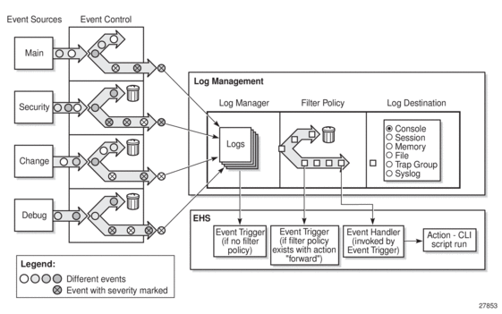 The log manager uses event filter policies to allow fine control over which events are forwarded or dropped based on various criteria. Like other filter policies in the SR OS, filter policies have a default action. The default actions are either: