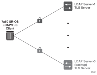 LDAP supports up to five redundant (backup) servers, as shown in Figure 25 and the configuration examples below. Depending on the timeout and retry configurations, if an LDAP server is determined to be out of service or operationally down, SR OS will switch to the redundant servers. SR OS will select the LDAP server with the next largest configured server index.