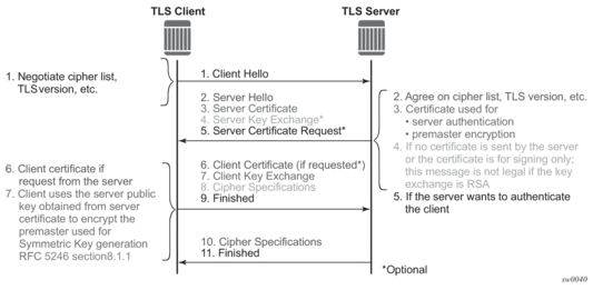 TLS protocol is used for authentication, and as such, the server can ask to authenticate the client via PKI. If the server requests authentication from the client, the client must provide an X.509v3 certificate to the server so that it can be authenticated via the digital signature of its client. SR OS allows the configuration of an X.509v3 certificate for TLS clients. When the server requests a certificate via the server’s Hello message, the client will transmit its certificate to the server using a client certificate message.