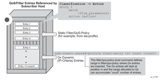 Gx flows are similar to dynamically created filter or ip-criteria (QoS) entries and are inserted within the entry range configured for the base filter/qos-policy.