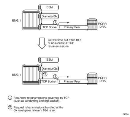 The handling of Diameter retransmissions is crucial for the Diameter Multi-Chassis Redundancy operation. Retransmissions provide the means to recover a Diameter session that was left in an unacknowledged state due to failure of the path between the node and the DRA/PCRF.