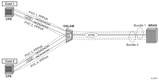 The term MLPPPoX is used to reference MLPPP sessions over ATM transport (oA), Ethernet over ATM transport (oEoA) or Ethernet transport (oE). Although MLPPP in subscriber management context is not supported natively over PPP/HDLC links, the terms MLPPP and MLPPPoX terms can be used interchangeably. The reason for this is that link bundling, MLPPP encapsulation, fragmentation and interleaving can be in a broader scope observed independently of the transport in the first mile. However, MLPPPoX terminology prevails in this section in an effort to distinguish MLPPP functionality on an ASAP MDA (outside of ESM) and MLPPPoX in LNS (inside of ESM).