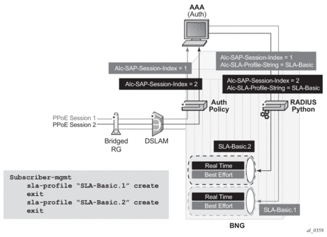 A Python script processes the RADIUS Access-Accept message to append the SAP session index to the SLA profile name to create the unique SLA profile name, in this example with the format: