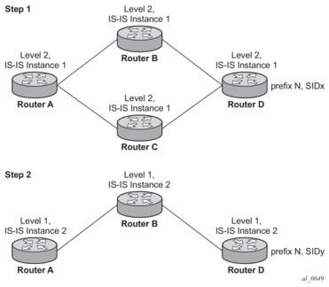 For example: In two different instances (L2, IS-IS instance 1 and L1, IS-IS instance 2—see Figure 17), Router D has the same prefix destination, with different SIDs (SIDx and SIDy).